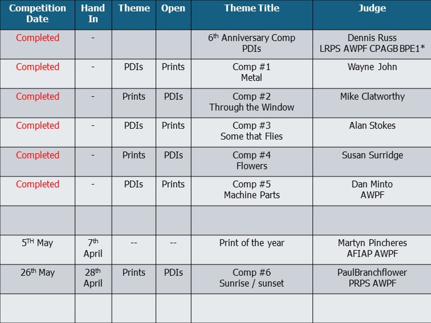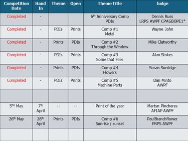 For each competition you may enter 2 PDIs and 2 Prints. There is always a theme.