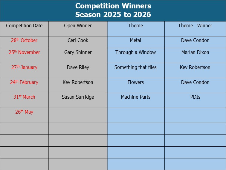 Our series of 6 Internal Competitions will continue this season allowing for both prints and PDI entries, as agreed at our AGMs. All details are on our website - but I will also keep you informed here in BBPS News and on our members Facebook page. As prints are involved, Hand Ins will always be at a face to face meeting. PDI entries should be sent to our Internal Competition Secretary, Gary Griffiths dbgriffiths31@gmail.com